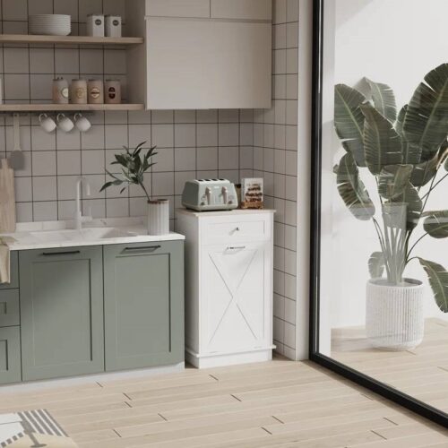 Trash Can Cabinet in White Wood Finish – Accommodates 10-Gallon Trash Bin