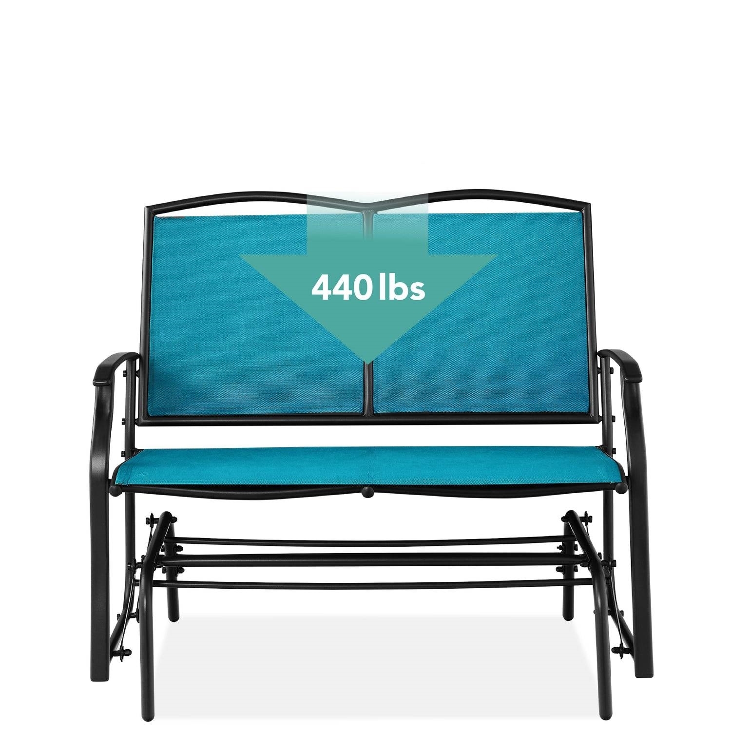 Glide into spring/summer with this 2 Seater Mesh Patio Loveseat Swing Glider Rocker with Armrests in Blue. Built with ergonomic armrests and robust textilene fabric which conforms to your body to provide a comfortable bench for hours of relaxation. The sturdy, yet light frame allows you to turn your patio, garden, balcony, or porch. Classic swing glider features a 38-inch loveseat to support you and your favorite guest-up to 440-pound capacity. Fade- and weather-resistant textilene fabric woven over a powder-coated steel frame provides lasting quality and comfort. A steel spring and pivot system lifts the seat to provide a smooth rocking motion while you relax in comfort