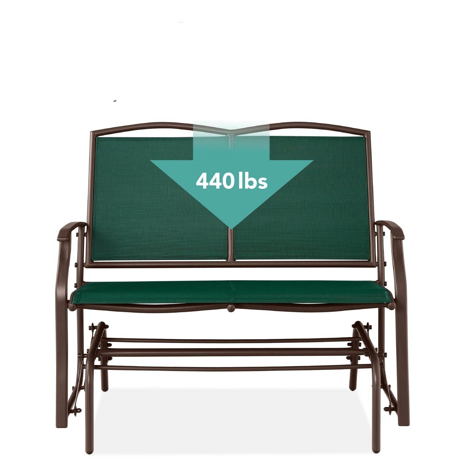 Glide into spring/summer with this 2 Seater Mesh Patio Loveseat Swing Glider Rocker with Armrests in Hunter Green. Built with ergonomic armrests and robust textilene fabric which conforms to your body to provide a comfortable bench for hours of relaxation. The sturdy, yet light frame allows you to turn your patio, garden, balcony, or porch. Classic swing glider features a 38-inch loveseat to support you and your favorite guest-up to 440-pound capacity. Fade- and weather-resistant textilene fabric woven over a powder-coated steel frame provides lasting quality and comfort. A steel spring and pivot system lifts the seat to provide a smooth rocking motion while you relax in comfort
