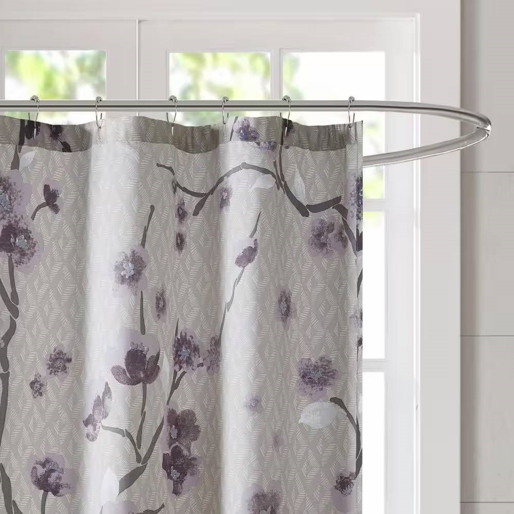 - 72 x 72 in Cotton Shower Curtain with Purple Grey Beige Floral Blossom Pattern