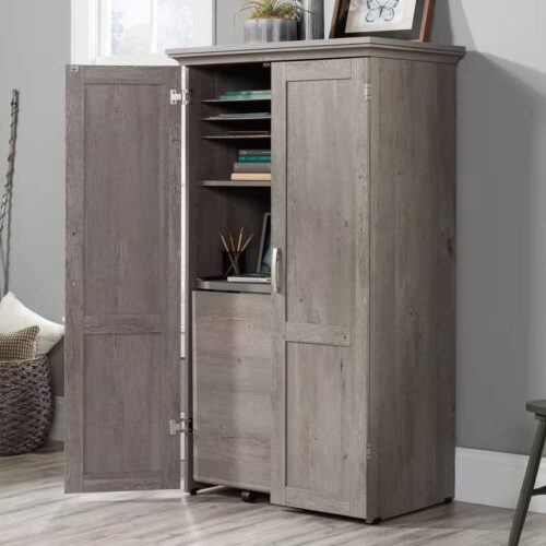 - Armoire with Drop Leaf Laptop Desk Craft Table in Grey Oak Finish – Made in USA