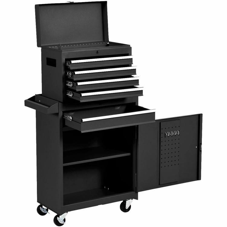 This Heavy Duty Steel Lockable Rolling Garage Tool Chest Storage Box has 5 drawers, 2 trays, a large bottom cabinet and a top box drawer, each drawer carrying 11 pounds with a total carrying capacity of that is 220 pounds. This cabinet can also be detached into 2 boxes, to be used separately making it a perfect addition to any garage or gear junkie! The body of this tool combination box is made of solid and durable steel, and the wheel is made of rubber-plastic synthetic material. High quality material selection and solid workmanship make the box structure strong, wear-resistant and durable. It has a long service life. This cart is equipped with drawer lock rod, which can be used to prevent the drawer from sliding out and lock the tool box (small lock are not included). In addition, the padding inside drawers and the padding at the top of lower box are EVA, which has good cushioning, seismic, heat insulation and other functions, and can effectively protect tools. This tool combination box has flexible and ingenious wheel design. This toolkits has four universal wheels which can rotate 360 degrees, and two of them have braking function.