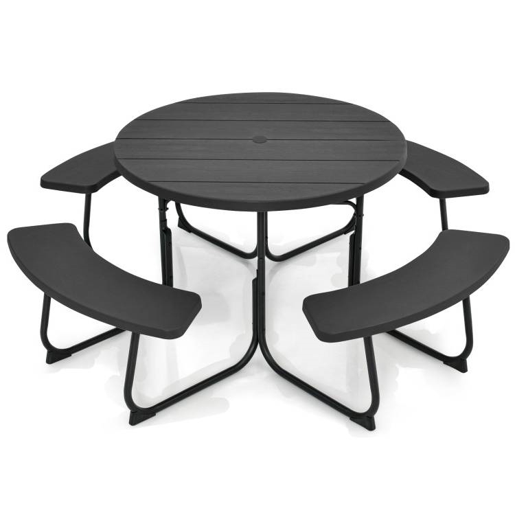 Black Outdoor Metal and HDPE Picnic Table Bench Set with Umbrella Hole – Seats 8