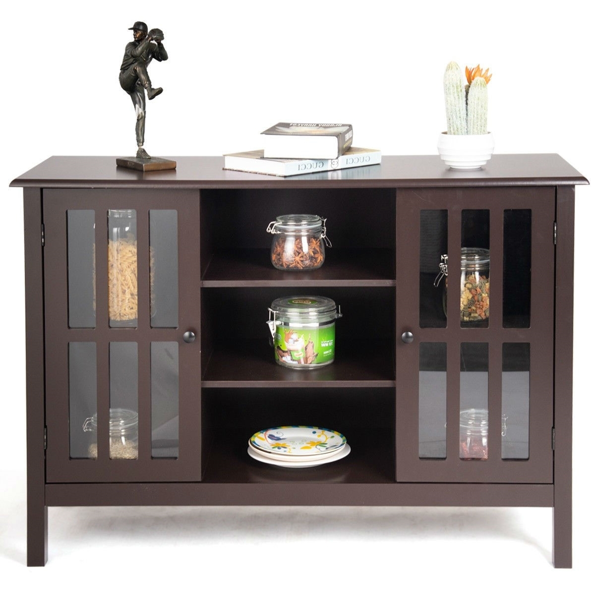 - Brown Wood Sofa Tale Console Cabinet with Tempered Glass Panel Doors