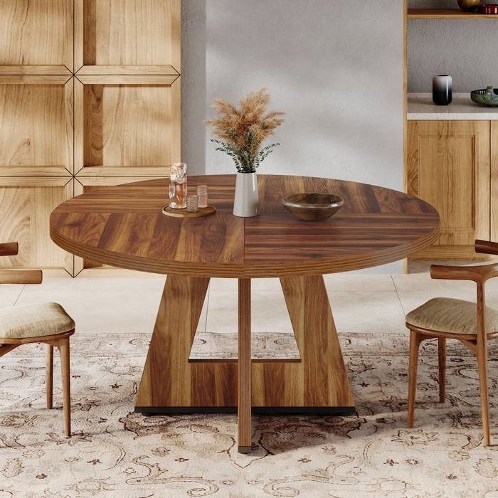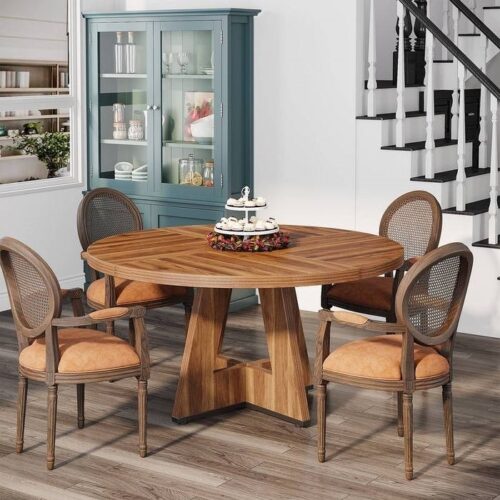 This Farmhouse Retro Brown Round 47-in Wooden Kitchen Table exhibits a charming farmhouse look and warm retro brown color, adding rustic elegance to any room. With its spacious 47-inch tabletop, this round dining table comfortably seats 4 people, perfect for dinner parties or family meals. Built from high-quality thick MDF, this table is durable, waterproof, scratch-proof, and easy to clean, promising long-lasting usability. In addition to dining, this table can serve as a study or work table or as a striking centerpiece in your living room, showcasing its versatile design. Comes with clear instructions and necessary hardware, this table is easy to assemble. We are here to assist with any queries about the rustic round dining table.