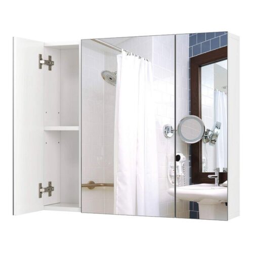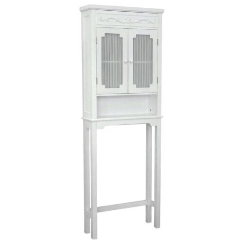 Do you have a small, cluttered bathroom? Get the clutter off your bathroom counter by putting a Frosted White Elegant Glass Doors Bathroom Space Saver behind your toilet. There’s no need to install this piece on the wall – just set it up and start maximizing every inch of your small bathroom. Two glass-paned doors with frosted white curtain details conceal an adjustable shelf for organizing your assorted toiletries. Made of medium-density fiberboard laminate with a charming antique white finish, this cabinet features delicate wood carving on the top rail as the crowning touch. Some assembly required.