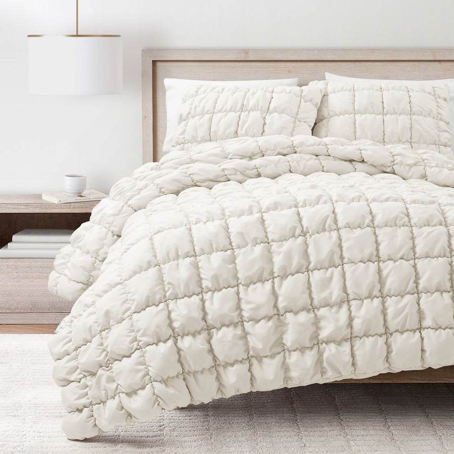Full/Queen Soft Lightweight Puff Textured 3-Piece Comforter Set in Off White