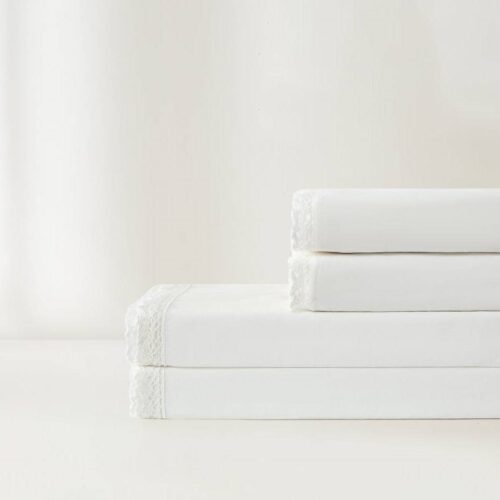 Queen Size 4 Piece 100-Percent Cotton Sheet Set in White with Lace Trim
