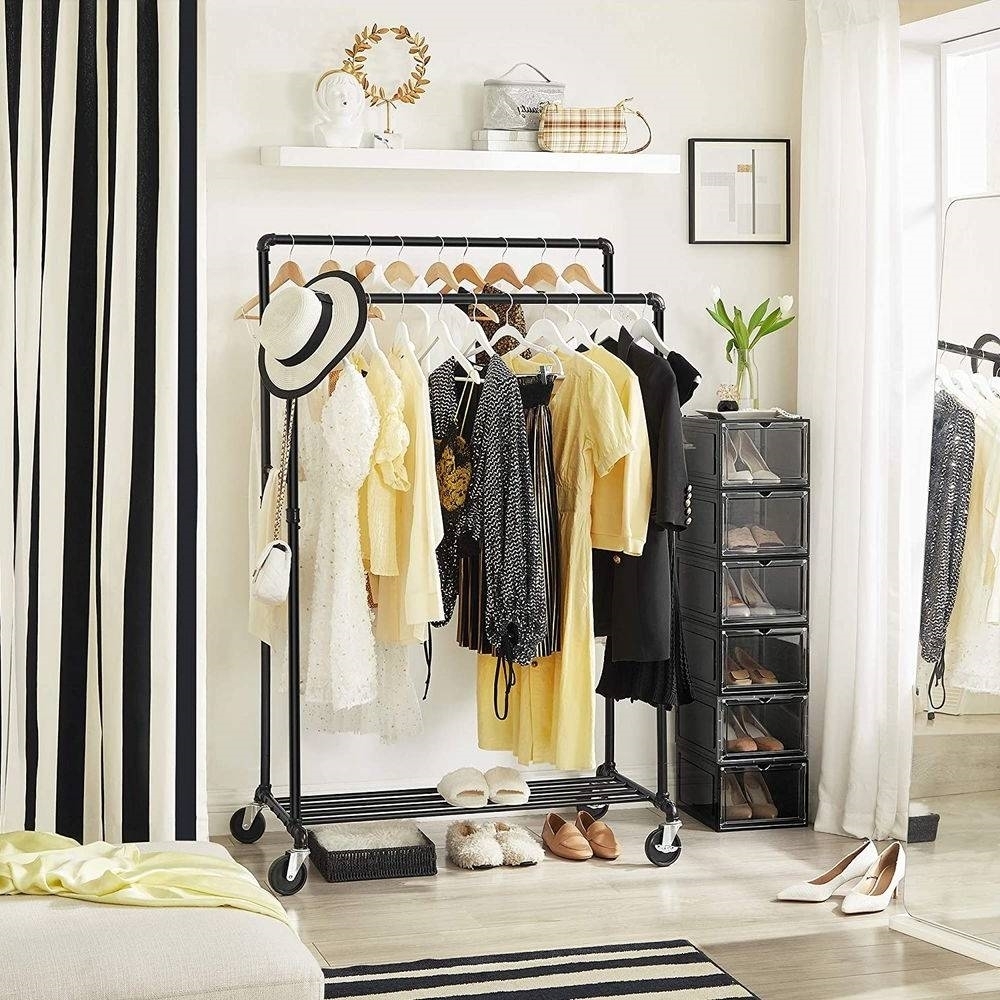 - For exceptional built quality, high weight capacity and convenient mobility – look no further than SONGMICS Industrial Pipe Double Rail Garment Rack.