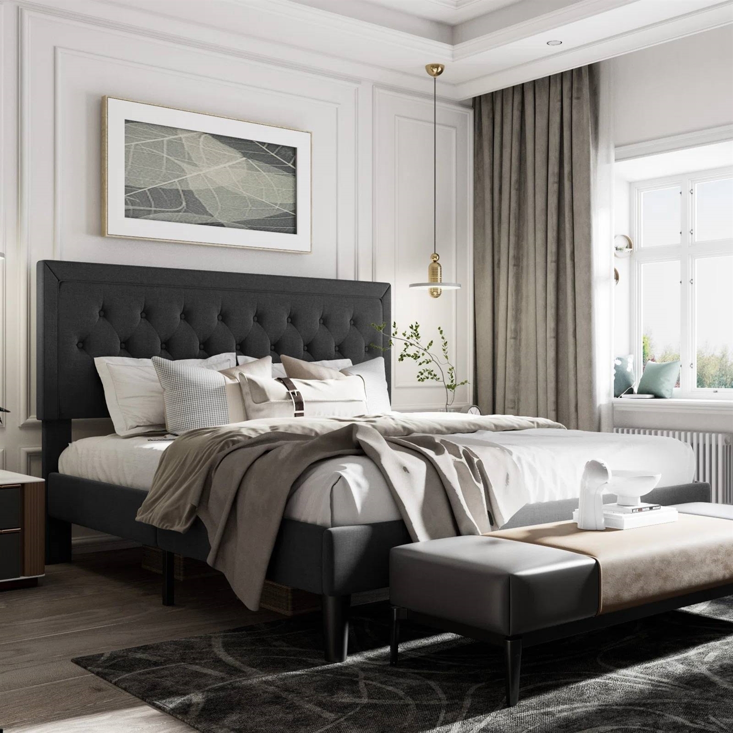 - King Black Linen Upholstered Platform Bed Frame with Button-Tufted Headboard