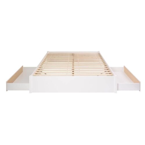 Add storage, style and comfort to your bedroom with this King Size White Wooden 4 Post Platform Bed Frame. The elegant design features solid wood posts with a sleek finished bed frame. Custom hardware keeps the bed aligned and requires only your mattress. The wood slat system, which comes in two sections, prevents motion transfer to provide individual comfort. The platform is raised 8.5 inches which allows for optional under bed storage. Suitable for standard king-sized mattresses. Wood slat system requires only mattress only – no box springs needed! Finished in fresh white laminate. 2 large drawers add storage functionality. Drawers can be added to either side of the bed. Each large roll out drawer (38″W x 5.5″H x 23″D) offers plenty of storage space for your blankets, linens, clothes or pillows. 5 caster wheels allow you to roll these extra-large drawers to reach your belongings with ease.