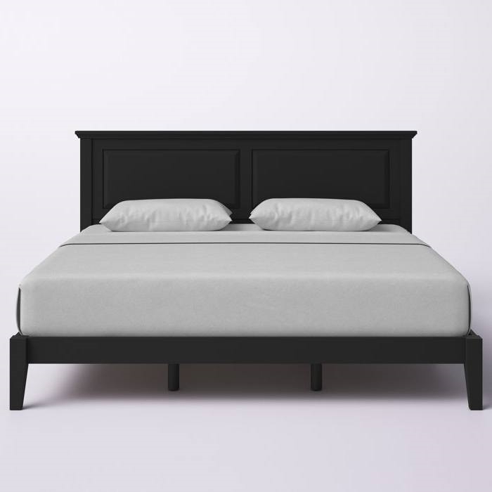 This King Size Retro Solid Wood Platform Bed in Black with prominent headboard is a must have for any bedroom! Inset panels and retro molding that adds refined elegance to any bedroom or guest room. Platform bed sits on straight and slightly tapered legs that raise this bed almost 8 inches off the floor. This system of slats eliminates the need for a box spring and works best with any standard mattress (recommended 10 inches of thickness). Assembly is required.