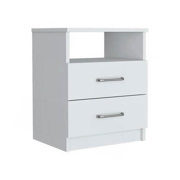 - Modern 2-Drawer Nightstand with Open Shelf in White Wood Finish