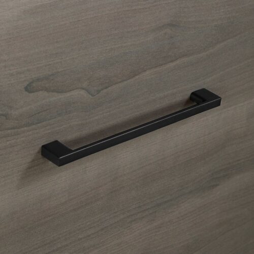 - Drawers open on Smart Glide slides with built-in stops and dampers; silver-finished metal loop-style handles
