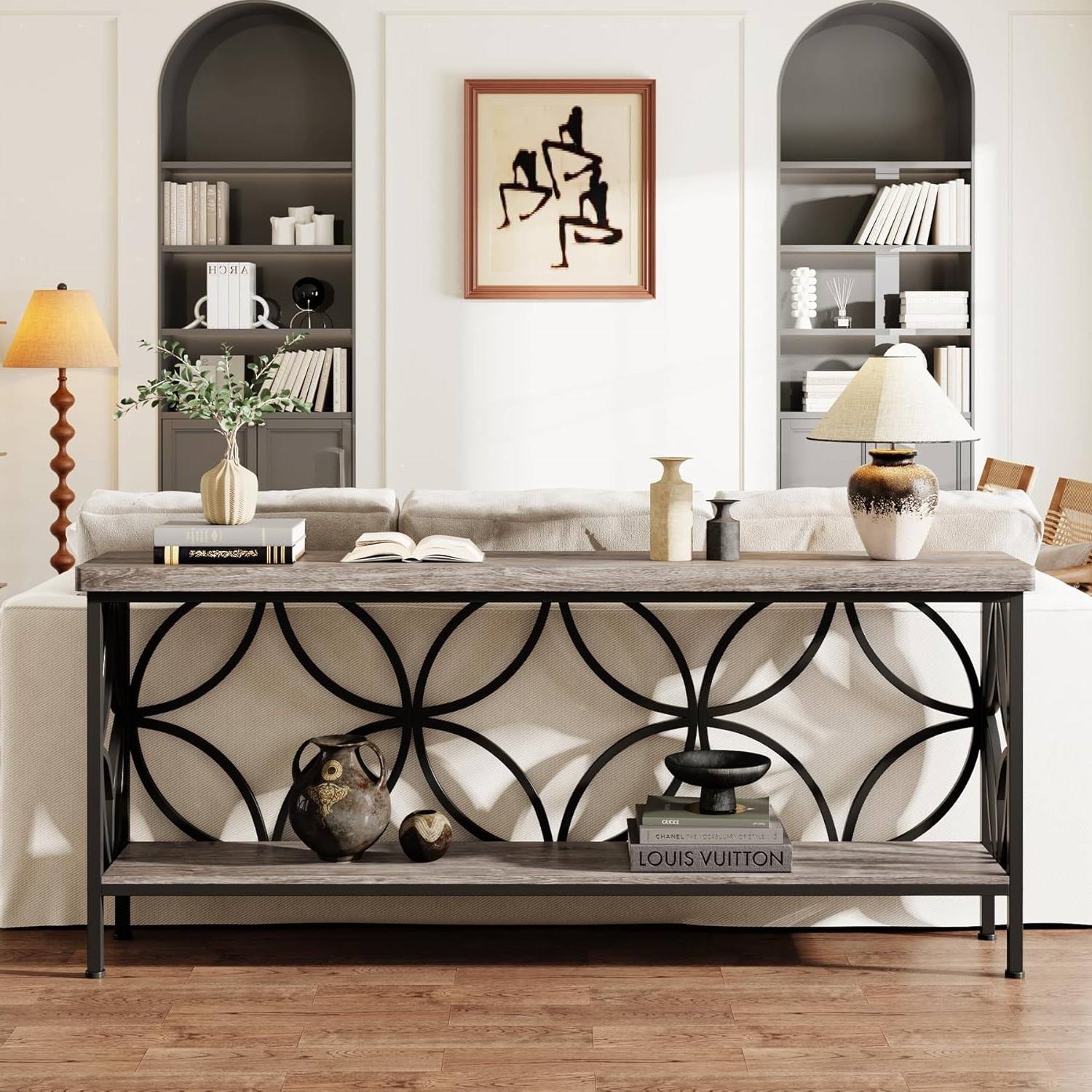 - Modern 70-inch Long Narrow Foyer Entryway Table with Grey Wood Top and Shelf
