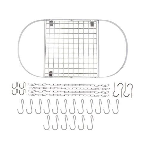 - Includes: 1 oval rack frame, 1 grid shelf, 4 lengths of chain, 4 ceiling hooks, 4 rack hooks, 12 pot hooks, 6 extra hooks