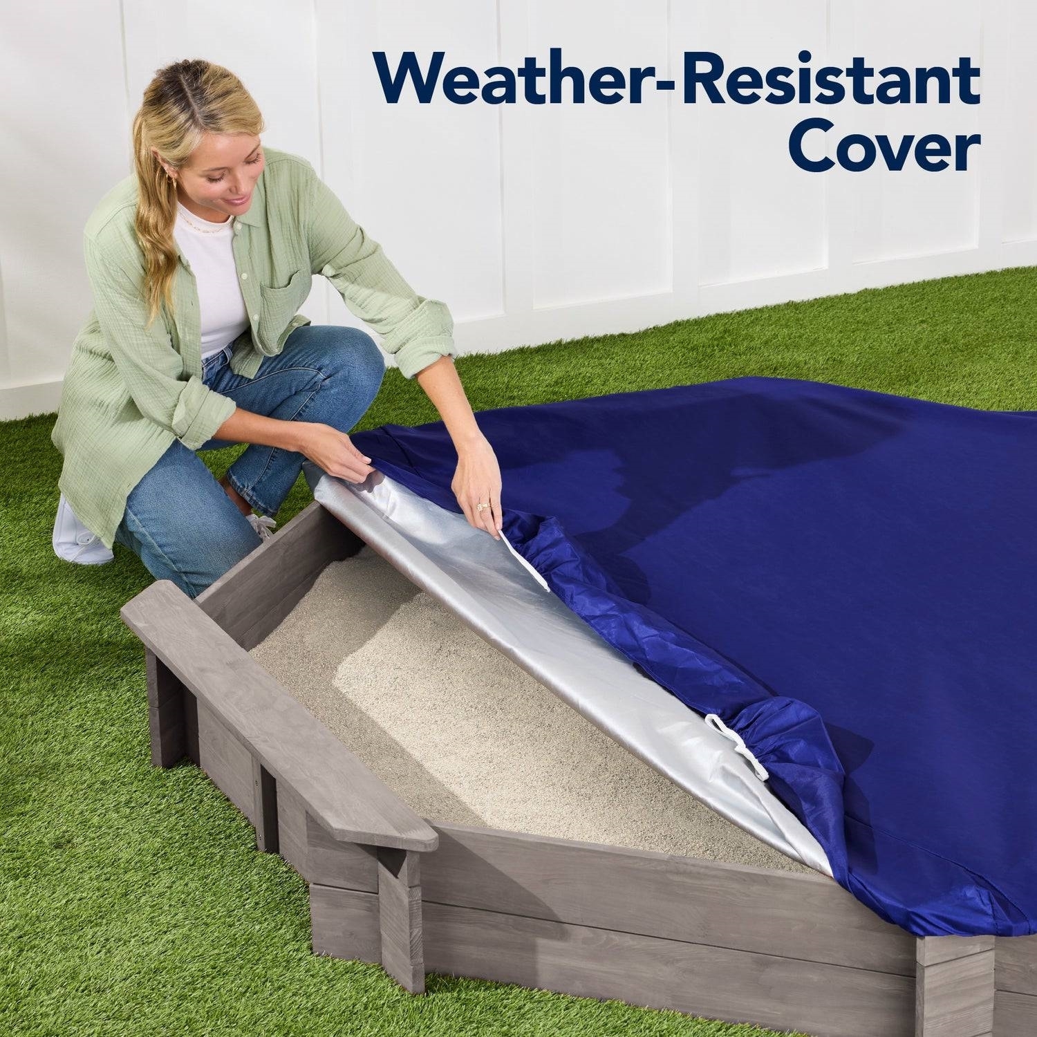 Schools officially out for summer! A uniquely shaped, spacious sandbox provides the perfect venue for children of all ages to meet, play, and explore their imaginations! Each bench comfortably supports up to 220 pounds so parents and children alike can enjoy an afternoon in the sun and sand! Keep your children’s play space clear of debris and moisture with a UV- and water-resistant cover An included liner goes under the frame to facilitate drainage and ventilation while discouraging invasive weeds in your child’s play space. NOTE: Play-grade sand is sold separately Durable, heat-treated hemlock wood panels are interlocked at the joints for a sturdy assembly that retains its shape and withstands the elements over time
