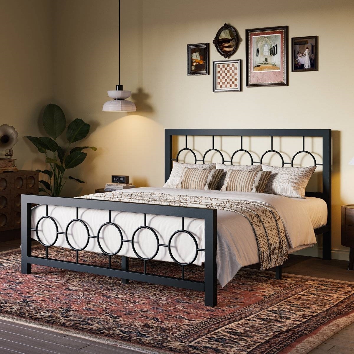 Queen Black Metal Platform Bed Frame with Circle Medallion Headboard Footboard