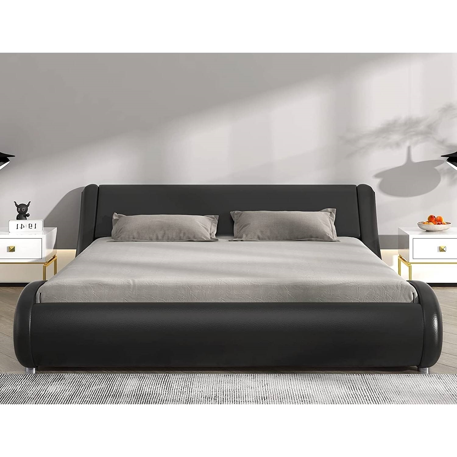 - Queen Modern Black Faux Leather Upholstered Platform Bed Frame with Headboard