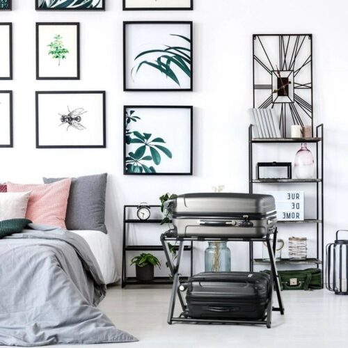 - Solid Wood High Back Folding Luggage Rack with Grey Straps in Dark Brown Finish