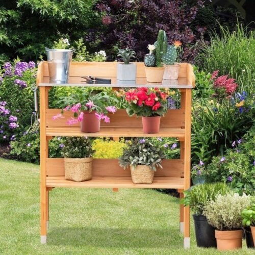 This Solid Wood Outdoor Garden Bench Table with Bottom Storage Shelves and Metal Top can be an ideal tool for garden job, they can put in small patios, decks, condos and apartments. Made of solid wood and metal sheet, the work station is durable and sturdy. With a hook, the work station can hang garden tools. The three shelves are provided for storing potting tools, seeds and other tools. The feet of the work station are covered by galvanization, protecting the feet from rotten. This work station can satisfy your garden potting job, do not hesitate to buy one.