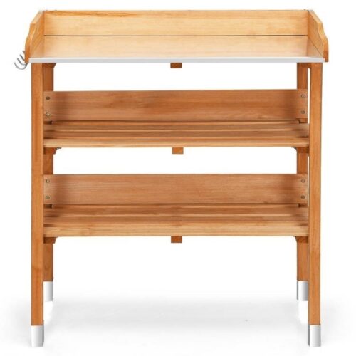 - Solid Wood Outdoor Garden Bench Table with Bottom Storage Shelves and Metal Top