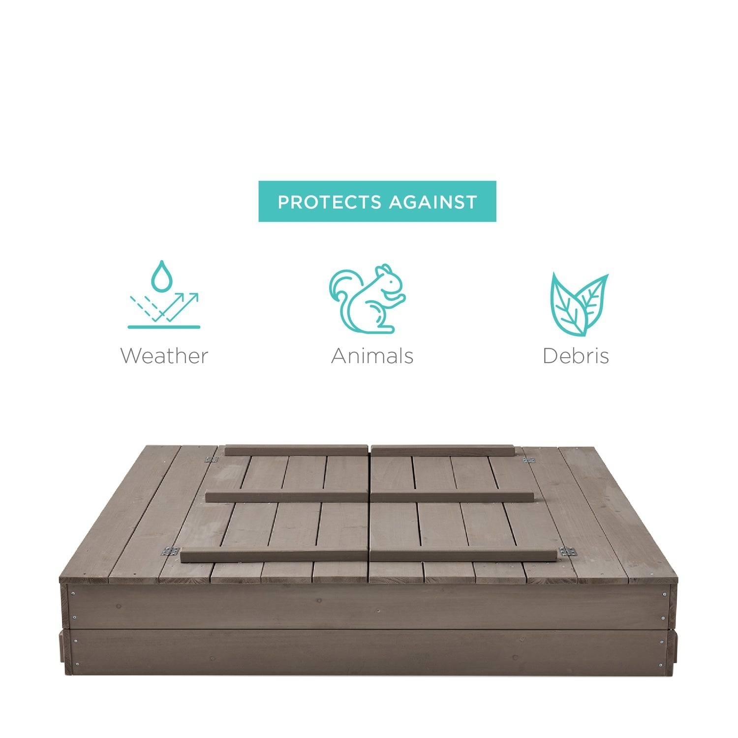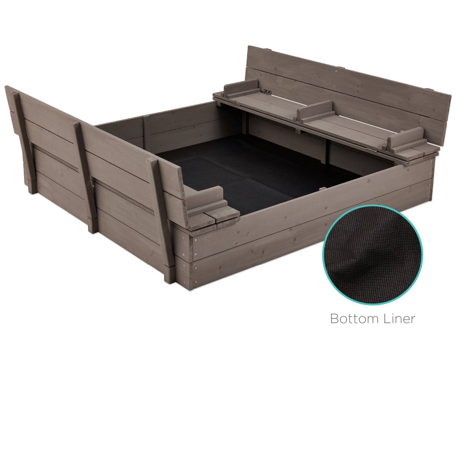 Come sit, shovel, and play! Sturdy Grey Cedar Kids Complete Seated Sandbox is a great way to entertain kids at home. Transform any backyard or outside play area into a space where children can socialize, entertain, and explore. Heat-treated cedar wood allow the sandbox to remain sturdy and durable for a long-lasting playtime solution. Built with a screen to help keep sand inside of the play area while allowing moisture to drain into the ground. Designed with a split cover that unfolds and turns into 2 benches for up to 4 children or 2 adults