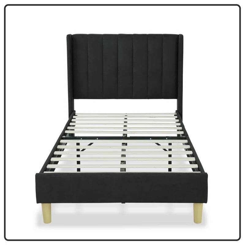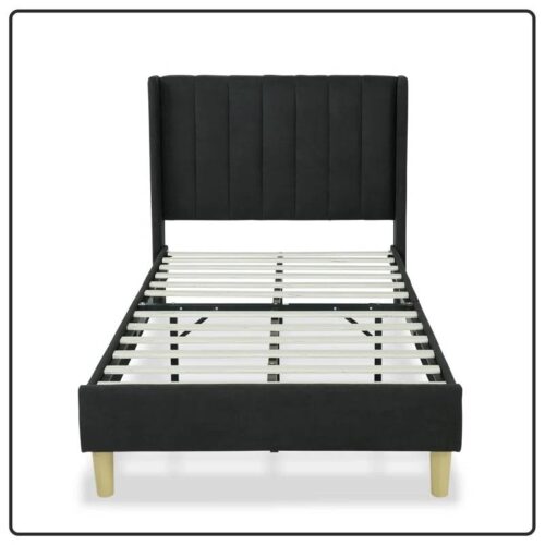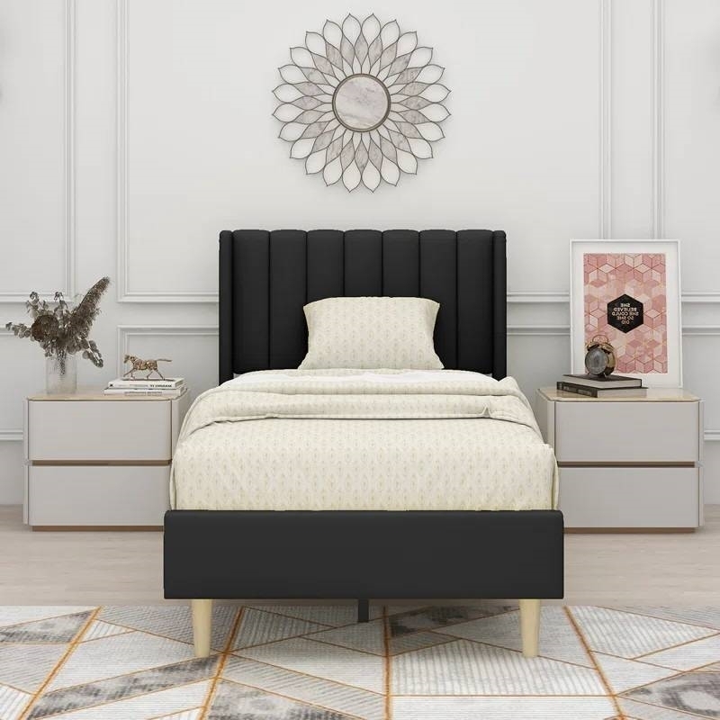 - Twin size Mid-Century Black Linen Platform Bed Frame with Upholstered Headboard