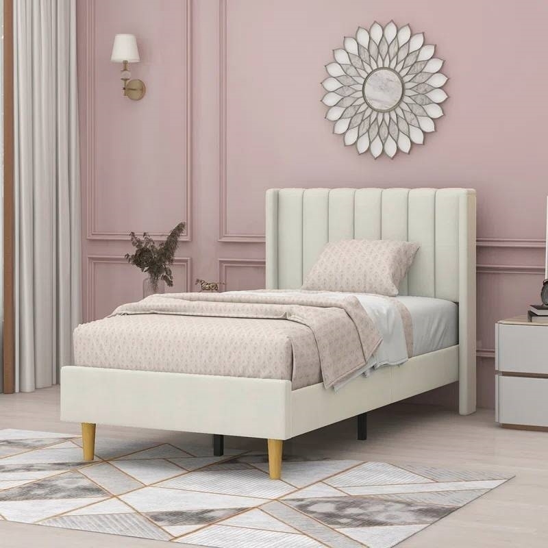 - Twin size Mid-Century Platform Bed Frame with Cream Velvet Upholstered Headboard