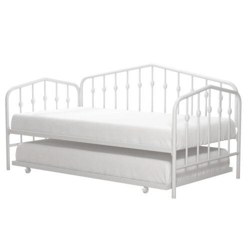 Modern and industrial, the Twin size Modern Industrial White Metal Daybed with Trundle Bed Frame is the perfect understated centerpiece for your bedroom or living room dcor. The round finials on the backrest and arms elevate this simple daybed into a piece of furniture that will be the envy of all your friends. The Twin size Modern Industrial White Metal Daybed with Trundle Bed Frame comes with a rollout trundle with four casters (two lockings and two non-lockings) to allow your overnight guests or childrens friends to sleep soundly. The daybed and trundle set fits two standard twin-size mattresses with a maximum thickness of 8 inches (sold separately). Whats more, thanks to the secured metal slats on both the daybed and the trundle, you do not require any additional box springs or foundations! Available in multiple color options to complement your room aesthetic, the metal daybed and trundle are perfect for your living room, your guest bedroom, or your childs bedroom.