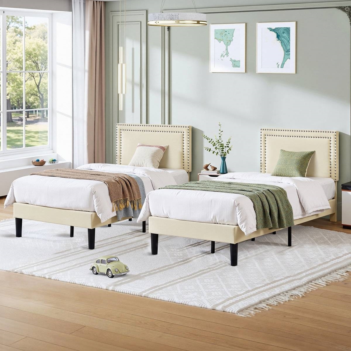 Twin Size – Set of 2 – Dorm Style Beige Tufted Upholstered Platform Beds