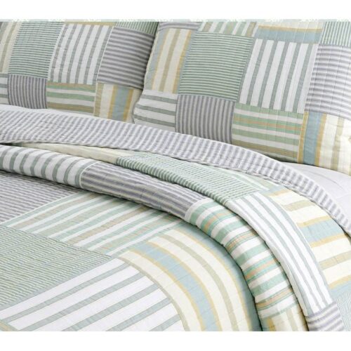 Create a beautiful tranquil welcoming place within your home with this Twin Size Soft Reversible Patches 100% Cotton Quilt Set. The balance of stripped patterns and calming colors tones are a perfect combination. A variety of horizontal and vertical stripped patterns in various shades of green, yellow, blue patchwork together in a square patchwork balance together. This cotton quilt set is reversible so that you can quickly and easily change the look of your room. Made completely of 100% Cotton. Easy-care machine-washable cotton material, this quilt set is easy and quick to launder.