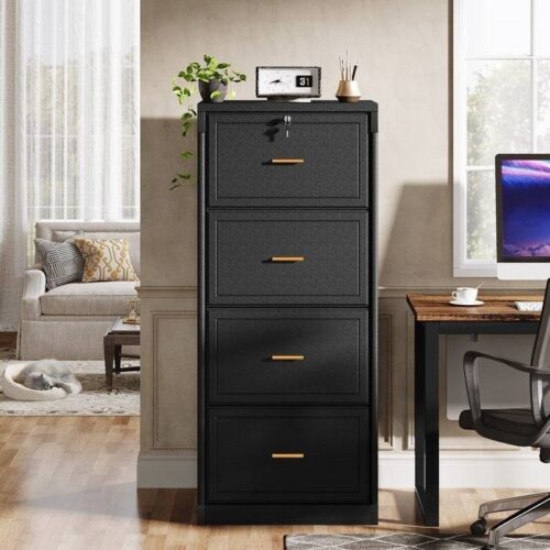 The slim, vertical design allows this 4 Storage Vertical Lockable File Cabinet to fit in any room, preserving floor space. With smart storage options, it easily holds your items while keeping your area tidy. With a black linen finish, this 51.2”H x 17.7”W x 22.8”L file cabinet includes four drawers, each with adjustable hanging rails perfect for storing letter/legal/A4/F4 size documents. Built with premium MDF for lasting durability, the filing cabinet is stable enough to support a printer or scanner. Extra safety is provided by anti-tip metal buckles for secure wall attachment. Metal ball bearing and full-extension drawer slides ensure your filing cabinet drawers won’t stick or derail, for easy opening and closing. Metal handles on each drawer add to the ease of use. This classic-styled filing cabinet comes with all necessary hardware and instructions for swift assembly. Quality is guaranteed, and customer service is readily available for any queries.
