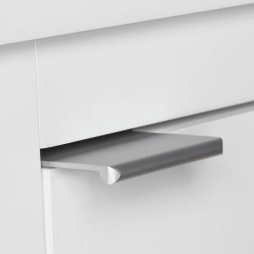 - Flat, silver handles add a modern impression to cabinet doors along with the clean, horizontal grooves